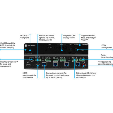 Send 4K HDR signals to multiple destinations up to 330′ away with this 4-Output Extended Distance 4K HDR HDMI to HDBaseT Distribution Amplifier from Atlona. The high dynamic range (HDR) distribution amplifier features one HDMI input and four HDBaseT outputs that can transmit DCI 4K60 video with 4:4:4 chroma sampling, multichannel audio, power, and control signals up to 330′ over a single Cat 6/6A/7 cable. It integrates seamlessly in commercial AV distribution applications and boasts support for HDMI pass-through to external monitors, audio de-embedding to a balanced output, EDID management, HDCP 2.2, CEC display control, RS-232 and IR control extension, remote power for receivers, and HDBaseT link testing.