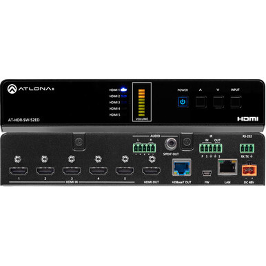 Quickly switch from one of five HDMI inputs to a single display with the 5 2 4K HDR HDMI/HDBaseT Matrix Switcher with Extended Distance from Atlona. Having display switching plus digital and analog audio de-embedding available makes the AT-UHD-SW-51 usable in A/V integration as well as presentation situations.