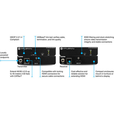 Extend your transmission of HDMI DCI/UHD 4K60 video signals up to 130′ using the Avance 4K HDMI Transmitter and Receiver HDBaseT Extender Kit from Atlona. The kit includes a transmitter, receiver, two power supplies, and surface mounting hardware to fit these compact units easily into your A/V environment in a classroom, conference room, or event space.