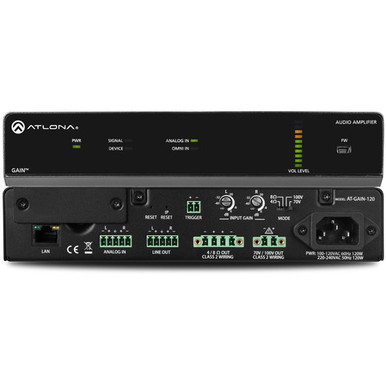 Atlona GAIN-120 Overview The Atlona Gain 120 is a compact power amplifier designed for low or high impedance applications. In addition to the amplified speaker output, a line level audio output allows the incoming audio to be fed into an additional amplifier or audio system. Key Features