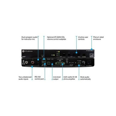 Atlona AT-GAIN-M50-LZ 2-Input Mixer Amplifier, RS-232 Control The Atlona AT-GAIN-M50-LZ is a two-input mixer amplifier designed for low impedance education and commercial applications. The amplifier features two unbalanced stereo audio inputs with independent level control and delivers either two channels of 25 W each into 4 or 8 ohms, or a single channel of 50 W.