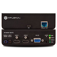 Atlona Conferencing Switcher for HDMI and VGA with Ethernet-Enabled HDBaseT Output 3 1 The AT-HDVS-150-TX is a 3 1 switcher and HDBaseT transmitter with two HDMI inputs and a VGA input with audio. Video signals up to 1080p, plus embedded audio, can be transmitted up to 230 feet (70 meters).