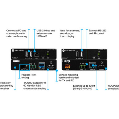 Extend your transmission of HDMI DCI/UHD 4K60 video signals including your USB device communication up to 130′ using the Omega 4K/UHD HDMI/USB-over-HDBaseT Lite Extender Kit from Atlona . The kit includes a transmitter, receiver, one power supply for the receiver, and surface mounting hardware to fit the two compact units easily into your A/V environment in a classroom, conference room, or event space.