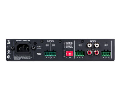 The CSA-2120 is a professional-grade power amplifier built for commercial and installed sound applications. The amplifier is a two-channel model providing simple analog front-end processing with a switch-mode universal power supply.